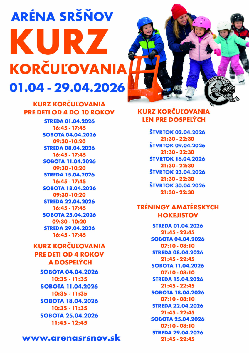 KURZY KORČUĽOVANIA PRE DETI OD 4 ROKOV A DOSPELÝCH POČAS MESIACA APRÍL 2026 POŽIČOVŇA KORČÚĽ A PRILIEB JE K DISPOZÍCII.