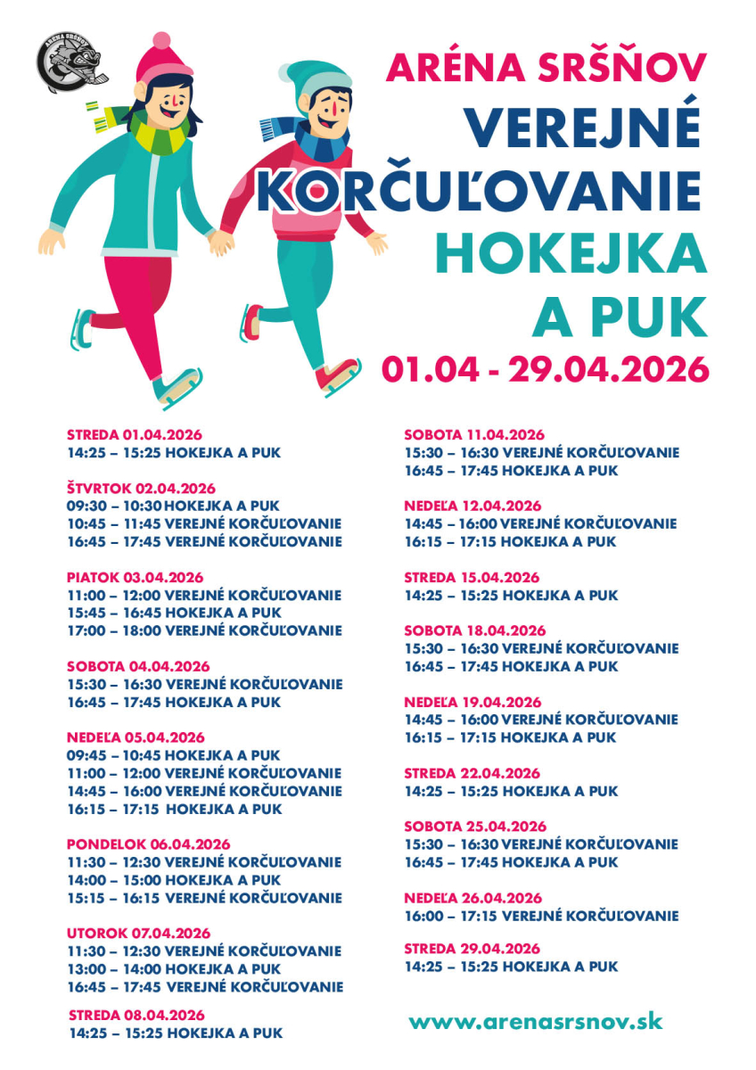 VEREJNÉ KORČUĽOVANIE a tiež akcia HOKEJKA A PUK v Aréne Sršňov pokračujú aj počas mesiaca Apríl 2026.